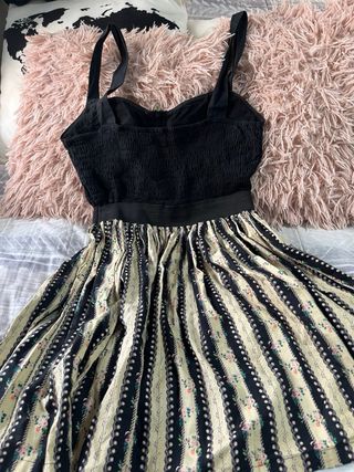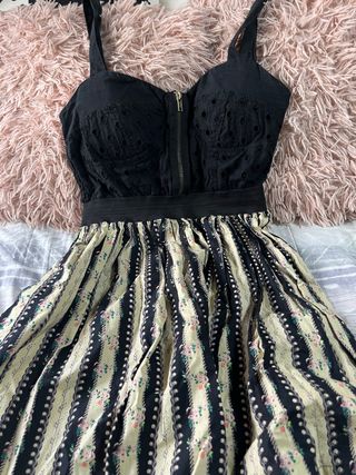 Vestido con corpiño negro y falda estampada. - Corpiño con detalle de encaje y cremallera frontal. - Cintura elástica. - Falda con rayas verticales y estampado floral.