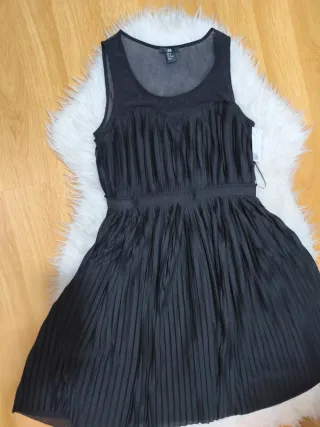 Vestido negro de H&M con tela elástica y diseño plisado. - Cuerpo superior de tela semitransparente. - Cintura elástica. - Falda e pecho en forma de corazón con plisada.