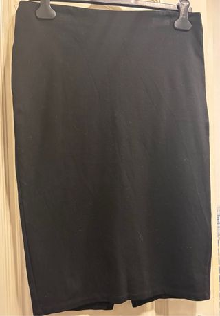 Falda midi negra, ajustada, de punto, talle alto, tejido elástico y apertura trasera. Talla S. Nueva sin etiqueta. Medidas: 94,5cm largo, 30cm cintura y largo apertura 59cm. Medidas aproximadas ya que el tejido es elástico.