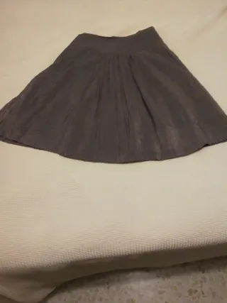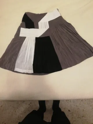 Conjunto de falda y camiseta. - Falda de color morado. Elástica, talla S/M. Se adapta bien. Largo: 50 cms (por la rodilla). - Camiseta negra con detalle frontal, en tonos lilas. Manga corta, cuello redondo y detalle de fruncido. 60 cms de largo aprox. Talla S/M (amplia, queda suelta). Precio del lote. *Por separado: 5€ por prenda.