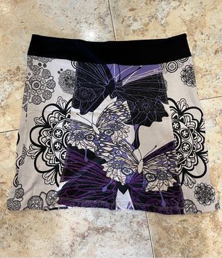 Falda corta con un diseño vibrante y juvenil. - Cintura elástica negra. - Estampado floral morado y motivos geométricos.