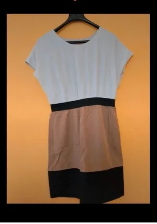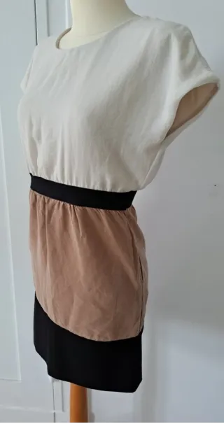 Vestido de Zara con un diseño tricolor. - Parte superior en color crudo. - Cintura con banda elástica negra. - Falda en tono camel. - Bajo en color negro.