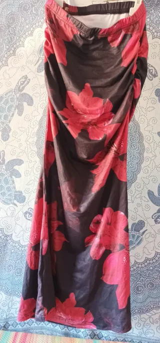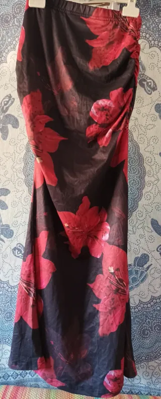 Falda larga con un llamativo estampado de flores rojas sobre fondo negro. Su diseño fluido y elástico la hace cómoda y versátil. Contorno de cintura 63 cm pero como es elástica permite dar de sí para un mayor ajuste. Está drapeada (fruncida) a la cadera. Mide 98 cm de larga. Tejido ligero y con caída. Está en perfecto estado no se ha llegado a poner nunca. Te invito a visitar mi perfil.