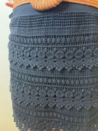 Minifalda negra de punto. 95% poliester; 5% spandex Largo total: 39 cms Contorno cintura: 73,5 cms Elástica, pero la cinturilla no. Cremallera lateral Detalle calado en el bajo. Precio no negociable