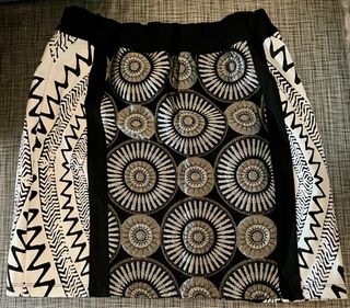 Falda corta con un diseño llamativo y moderno. - Estampado central de círculos concéntricos. - Paneles laterales con diseño geométrico en zigzag. - Cintura elástica negra.