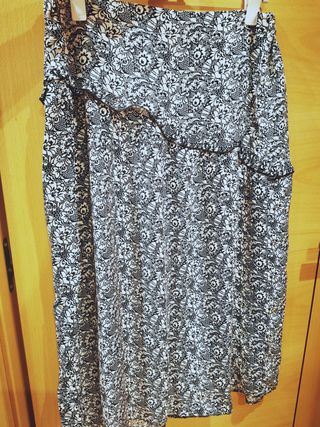 Preciosa falda larga con estampado de flores blancas sobre fondo negro. Cintura elástica, apertura en un lado y tela ligera.