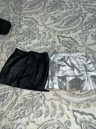 Lote de dos faldas para niña, talla 7-8 años. - Una falda negra con acabado tipo cuero. - Otra falda plateada con volantes.