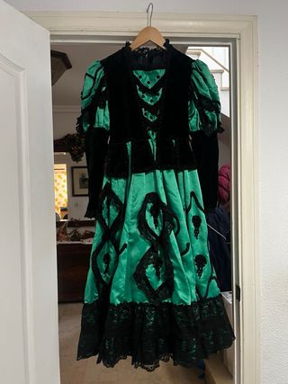 No admito devolución,Escucho oferta Envío rápido por inpost, entrega en mano también pero solo en Mairena del Aljarafe Sirve para adulta muy delgada y baja estatura o para niña/adolescente Hecho a mano por lo que mirar directamente medidas, delgada todas formas tiene mucha tela para ampliar y también se puede bajar la falda Tiene alguna manchita microscópica leve que se puede quitar o incluso se disimula con los pliegues de la tela Sevilla Valencia goyesca madrileña malagueña ninfa regional terciopelo encajes verde negro vintage retro tirolés Austria baile jota Cataluña