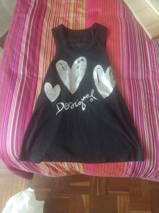 Camiseta original de desigual, sin mangas, para niñas o mujeres delgadas. Pone talla 11-12 que equivale a una XS. Negra con corazones plateados brillantes. En perfecto estado. Muy bonita y elegante. Para poner con faldas, pantalones... Prenda de marca y calidad.