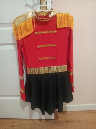 Traje de Ringmaster para niña, ideal para espectáculos o fiestas de disfraces. Es un diseño llamativo y elegante. - Incluye un vestido con detalles dorados y flecos naranjas. - La parte superior es roja y la falda negra. - Diseño con abertura en la espalda.