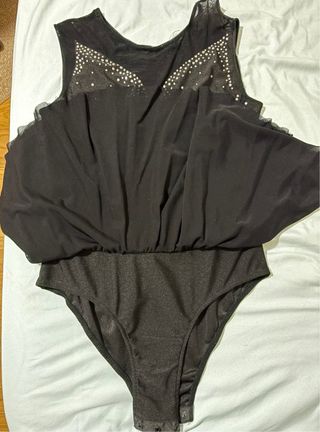 Vestido para patinaje artístico o gimnasia rítmica, con un diseño llamativo y detalles brillantes. - Adornado con pedrería plateada. - Falda con vuelo. - Tirantes. Talla 9-12 años. Sin marca