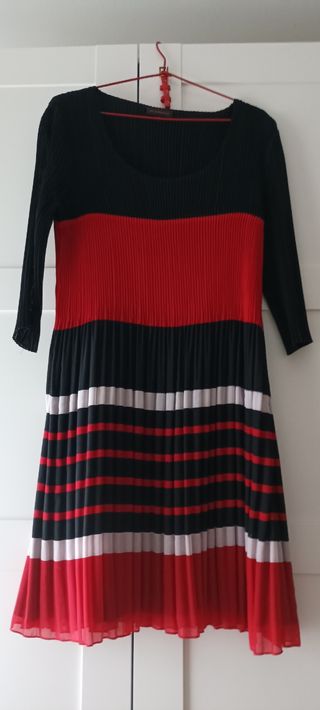Precioso vestido de Adolfo Domínguez, ideal para cualquier ocasión. Es una prenda elegante y versátil. - Diseño bicolor en rojo y negro. - Falda plisada. - Manga tres cuartos. - Corte a la altura de la rodilla.