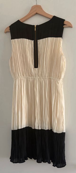 Elegante vestido de cóctel con un diseño moderno y sofisticado. - Cuerpo superior en color blanco roto. - Detalle de hombros en negro. - Falda plisada en dos tonos: blanco roto y negro. - Cintura elástica para un ajuste cómodo. - Cierre de cremallera en la espalda.