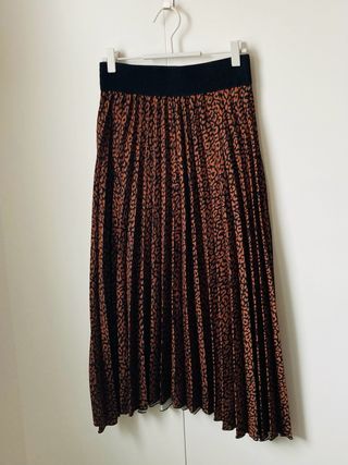 Falda midi con un llamativo estampado de leopardo. Su diseño plisado le da un movimiento elegante. - Cintura elástica negra. - Largo midi. - Estampado de leopardo en tonos marrones y negros.