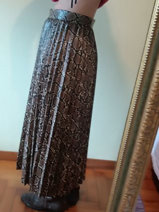 Falda larga con estampado de serpiente, en cuero sintético de muy buena imitación. Diseño plisado. En perfectas condiciones. - Largo hasta el tobillo. - Cintura elástica para mayor comodidad. - Estampado de serpiente en tonos marrones y negros.