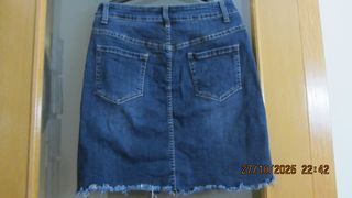 Falda tejana corta con un diseño moderno y detalles de tachuelas. - Cintura alta. - Cierre de cremallera y botón. - Bolsillos delanteros y traseros. - Tachuelas decorativas en bolsillos y laterales. Se ha usado pero está en perfecto estado. Me encanta, pero la vendo porque me va pequeña ya.