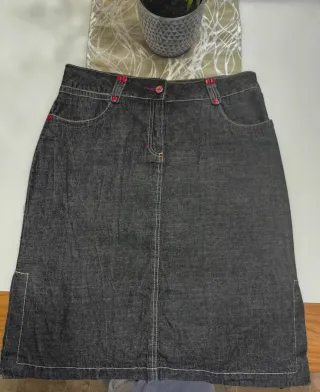 Falda tejana de corte recto con detalles en color rojo y cinturón rojo. Está sin estrenar, me quedó pequeña. Aberturas laterales. Medida : cintura 42, cadera 52, largo 62. - Diseño de 2 bolsillos delanteros y uno trasero. - Costuras decorativas en contraste. - Cierre de botón y cremallera.