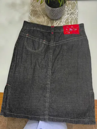 Falda Desigual tipo tejana con fondo gris y estampado logo en negro. Cierre delantero cremallera con adorno cinturón en tela,bolsillos y bolsillos tipo cargo en laterales. Medidas:cintura 42 y de cintura a bajo 52. En perfecto estado.