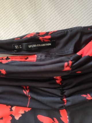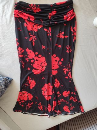 Preciosa falda larga de tubo, con estampado floral rojo sobre fondo negro. Es una prenda elegante y cómoda, ideal para cualquier ocasión. - Diseño entallado que estiliza la figura. - Estampado floral rojo vibrante. - Tejido suave y ligero.