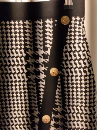 Falda de tubo de punto con un diseño de pata de gallo en blanco y negro. Presenta un detalle de botones dorados en el lateral. - Diseño de pata de gallo. - Botones dorados decorativos.