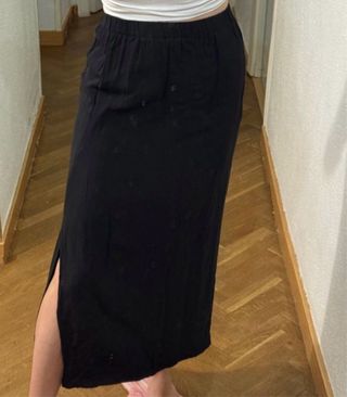 Falda larga con un diseño semitransparente. - Tejido ligero y fluido. - Cintura elástica para mayor comodidad. -Aberturas laterales -Falda de tubo en la zona interior hasta la mitad del muslo para que no se transparente -Perfecto estado, usada una vez