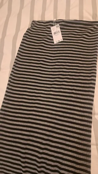 Falta tubo HM sin estrenar. Tiene forro. La tela es un pelín elástica. Es una 40, pero yo diría que esta más bien entre una 38-40. Medidas: Cintura: 38 cm Cadera: 49 cm Largo: 68 cm