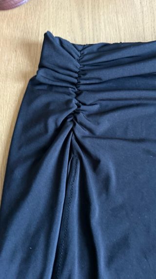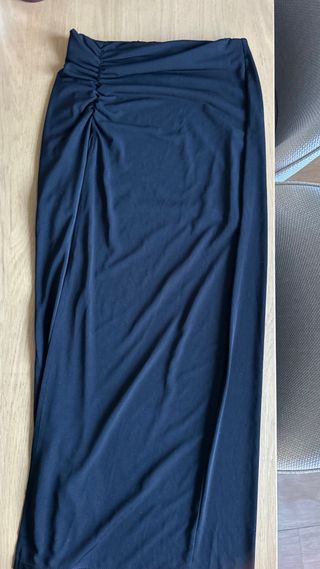 Falda larga negra de Stradivarius con un diseño ajustado y elegante. - Detalle de fruncido lateral. - Abertura en la pierna para mayor movilidad. - Tejido elástico y cómodo.