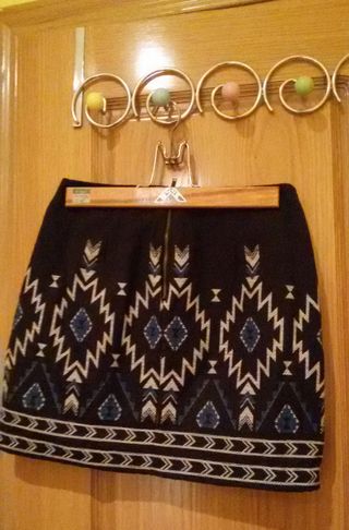 Falda tubo corta con estampado geométrico. Con forro. Cierre con cremallera por detrás. Talla 34 en etiqueta pero da para talla 36 - Diseño con motivos tribales en blanco, azul y negro. - Detalle de pedrería. - Corte mini.