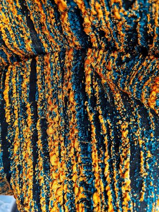 Tiene una abertura en la parte de detras y es de punto con toques metalizados