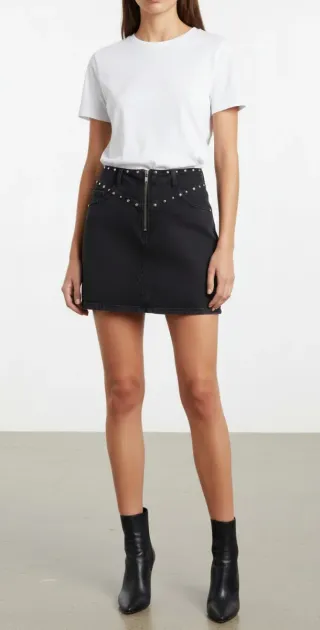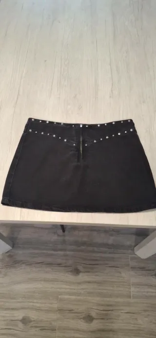Falda vaquera negra con tachuelas metálicas. A estrenar. - Diseño con cremallera frontal y muy moderno.