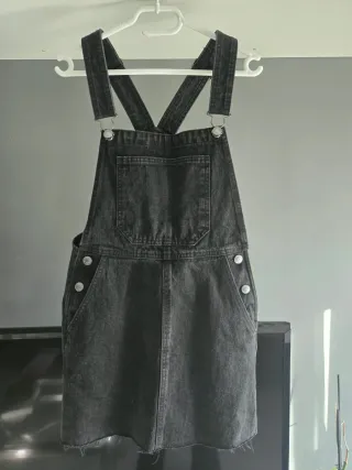 Peto vaquero (falda) de Bershka en color negro. Un básico para tu armario. - Diseño con tirantes ajustables. - Bolsillos delanteros, laterales y traseros - Cierre de botones en los laterales. - Bajo deshilachado. Talla xxs, puesto una vez.