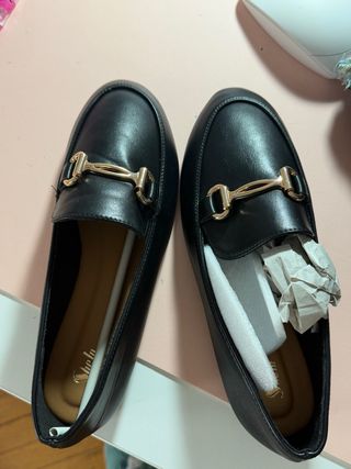 Mocasines negros con detalle dorado – Talla 35 Elegantes mocasines negros con acabado efecto piel y detalle metálico dorado en el empeine. Un modelo clásico y muy versátil, perfecto tanto para looks formales como para outfits casual. ✔️ Talla: 35 ✔️ Color: negro con herraje dorado ✔️ Estado: prácticamente nuevos, muy poco uso (ver fotos) ✔️ Suela: cómoda y resistente Son ideales para combinar con vaqueros, pantalones de vestir o faldas. Un básico elegante que nunca pasa de moda.