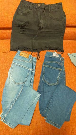 Dos pantalones tejanos talla 34 de Pull&Bear Denim y otro Mango y falda vaquera negra talla XS de Pull&Bear. Están nuevos.