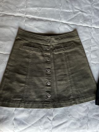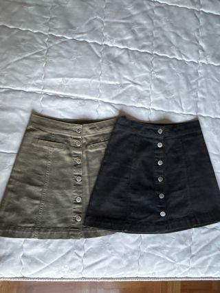 Lote de 2 faldas vaqueras de la marca H&M, una negra y otra verde oliva. - Tienen cierre de botones. - Son de corte recto. - Están en perfecto estado.