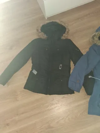 Lote de ropa, varias prendas a estrenar con etiqueta. dos abrigos con capucha. El azul va forrado por dentro y el negro tiene un cinturón para ajustar la cintura. - Un abrigo negro. - Un abrigo azul. = 5 camisetas tirantes. - 4 manda larga. - 1 mini falda vaquera y 3 shorts.