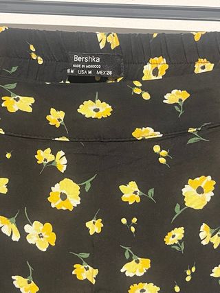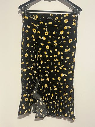 Falda midi con estampado floral de Bershka. - Diseño con abertura. - Estampado de flores amarillas sobre fondo negro.