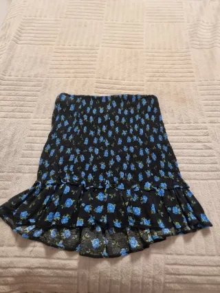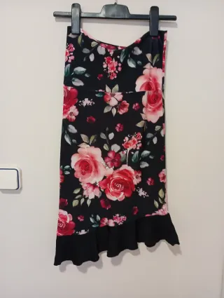 Estampado floral con rosas sobre fondo negro.Volante negro. Cintura muy ancha que se puede reducir a la mitad Muy buena calidad