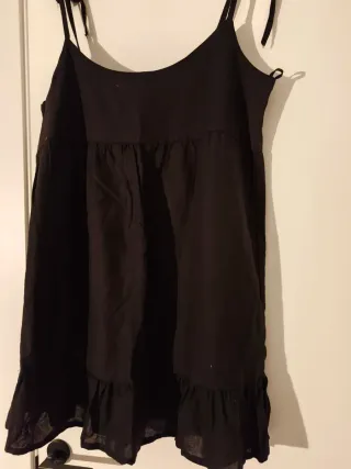 Vestido de lino negro con un diseño ligero y fresco. - Tirantes ajustables con lazada. - Falda con volantes. - Tejido de lino.