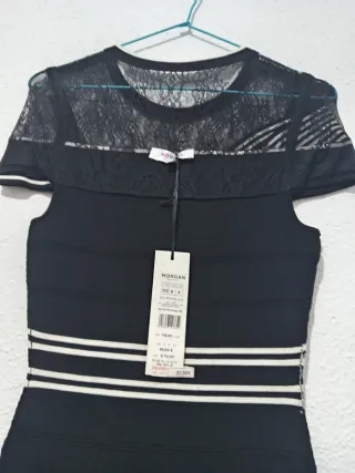 Vestido de la marca Morgan con detalles de encaje. - Diseño con cuerpo de encaje y falda a rayas. - Manga corta. - Cierre de cremallera en la espalda.