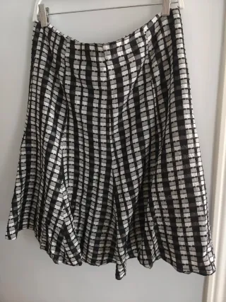 Falda corta con estampado de cuadros. La tela es gordita, cruzada por delante pero cosida. La composición es poliéster,viscosa y un 4% de elastano. De cintura mide 31 ctm. pero como por detrás va fruncido da hasta 36 cm., de largo 36 cmt.