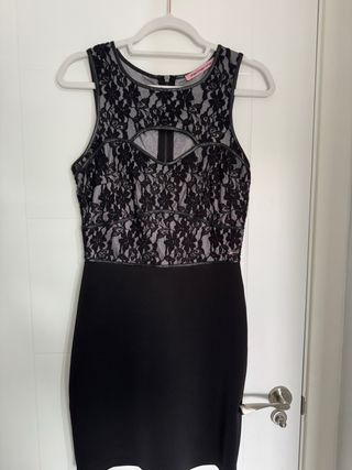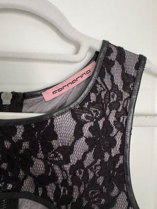 Elegante vestido de la marca Fornarina con un diseño sofisticado. - Cuerpo superior de encaje negro. - Detalle cut-out en la zona del escote. - Falda recta en tejido negro.