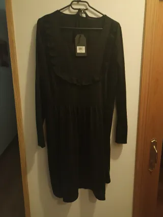 Vestido negro de manga larga con un detalle de volantes en la parte delantera. - Diseño con cuello redondo. - Falda con fruncido. - Manga larga.