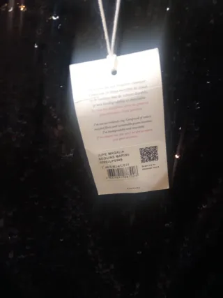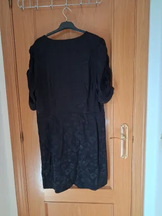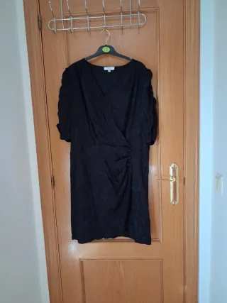 Vestido cruzado satinado en color negro con dibujo jacquard floral y botones forrados en la cintura, muy elegante y femenino. Tejido ligero con caída y frunce en la falda que estiliza mucho la figura, ideal para eventos, cenas o fiestas. Estado muy bueno, sin rotos ni manchas visibles, usado solo en ocasiones especiales.#vestidonegro #vestidoelegante #modafememina #ropafiesta #segundamano #blackdress #wrapdress #eveningwear #womensfashion #secondhandstyle #robefemme #robeNoire #robedeSoirée #modefemme #secondeMain