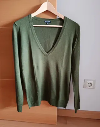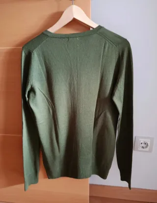 Jersey de color verde, con una composición de seda y cashmere, muy agradable y calentito. Ideal para los días de oto e invierno, para combinar con vaqueros, pantalones negros, faldas... Talla M. Está en perfecto estado.