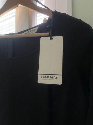 Vestido de la marca Naf Naf con un diseño moderno y llamativo. - Parte superior en color negro. - Falda con bloques de color rojo y blanco. - Manga larga.