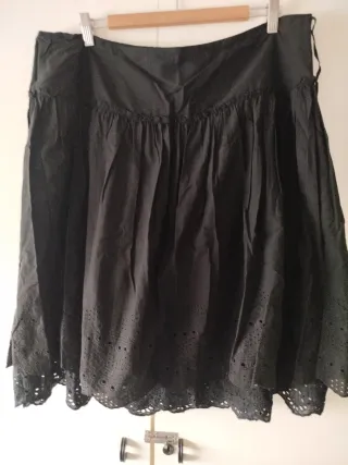 Falda negra con un bonito detalle de bordado en el bajo. - Diseño con vuelo. - remallera lateral - Bajo con puntilla calada.