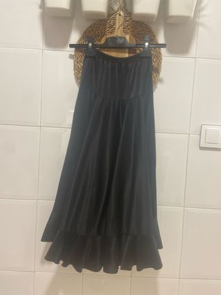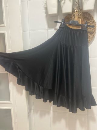 Falda larga de estilo flamenco, ideal para bailar o para un evento especial. Su diseño combina elegancia y movimiento. - Largo hasta los tobillos. - Detalle de volantes en cascada en el bajo. - Forro interior en contraste. - Apta para adolescentes o jóvenes. - Cintura de goma elástica La cintura sin estirar mide25,5 cm y estirada completamente 50cm y de largo 88cm.