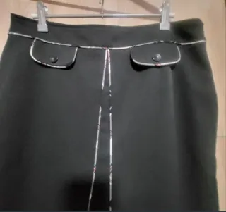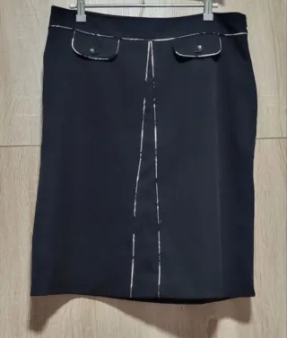 Elegante falda negra con detalles de diseño. - Dos bolsillos frontales con solapa y botón. - Pespuntes decorativos en la parte delantera central. - Ribete en contraste en la cintura y los bolsillos. - Largo de 54 cm ,cintura de 42 cm ,talla XL ( 42 ),de la marca Picotazos. Está en muy buen estado.