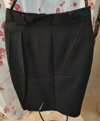Falda negra , recta con pequeña apertura delante , con detalles en rojo , largo de 60 cm .Talla 34-36 (aunque pone 39 da muy poca talla: un 34-36 ) , de la marca Adolfo Domínguez . Está como nueva .