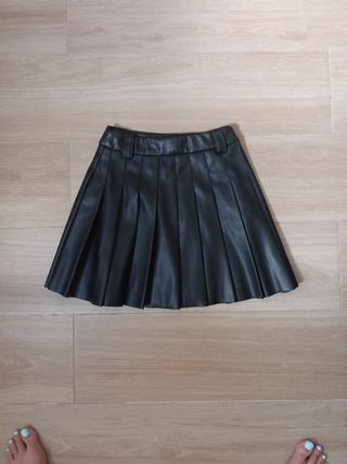 Falda polipiel negra con tablas cortita talla 34. Puesta en una ocasión está prácticamente nueva, queda increíble.